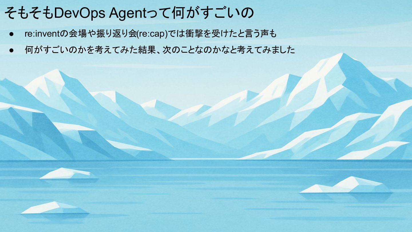 そもそもDevOps Agentって何がすごいの • re:inventの会場や振り返り会(re:cap)では衝撃を受けたと言う声も • 何がすごいのかを考えてみた結果、次のことなのかなと考えてみました