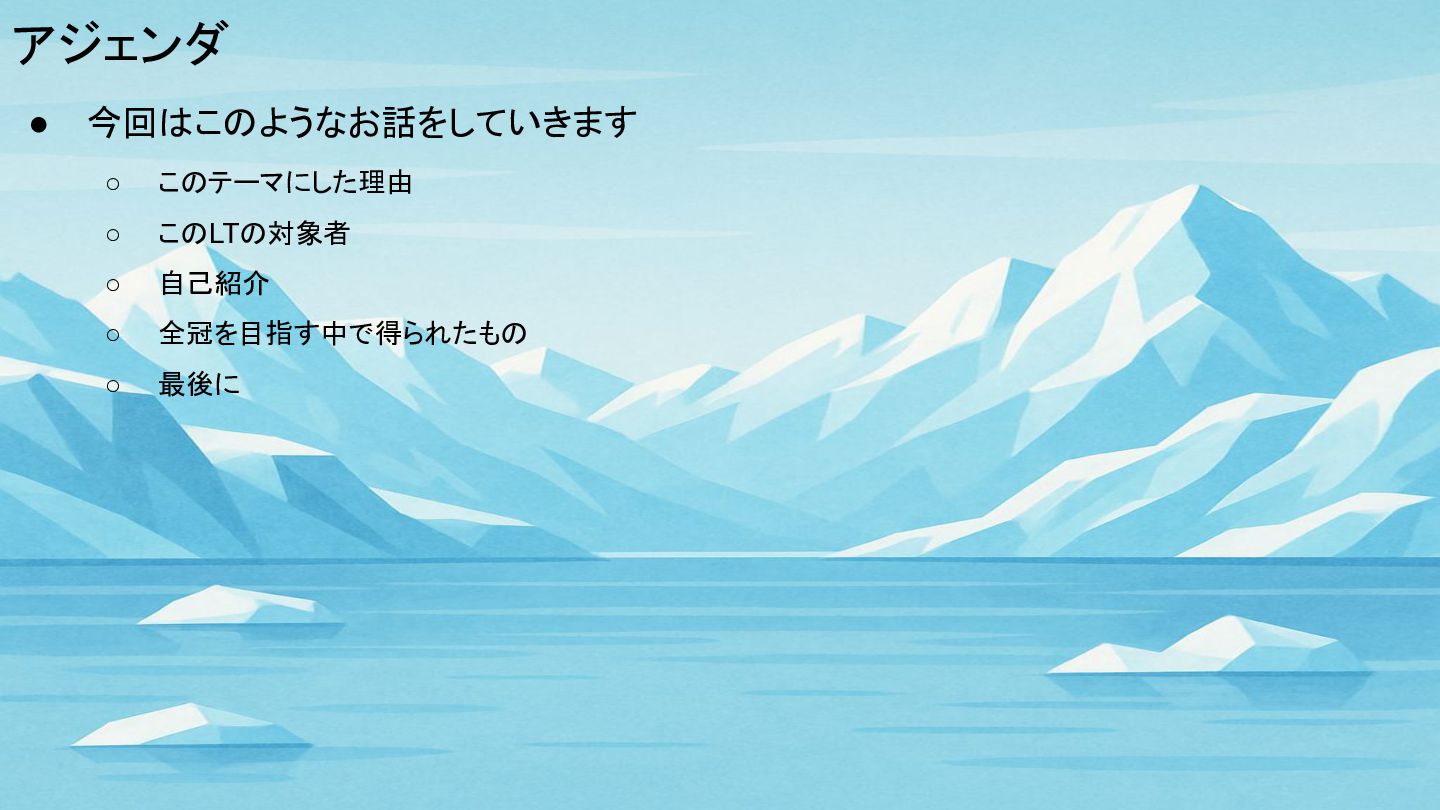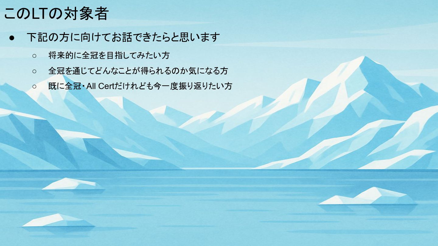 このLTの対象者 • 下記の方に向けてお話できたらと思います ◦ 将来的に全冠を目指してみたい方 ◦ 全冠を通じてどんなことが得られるのか気になる方 ◦ 既に全冠・All Certだけれども今一度振り返りたい方