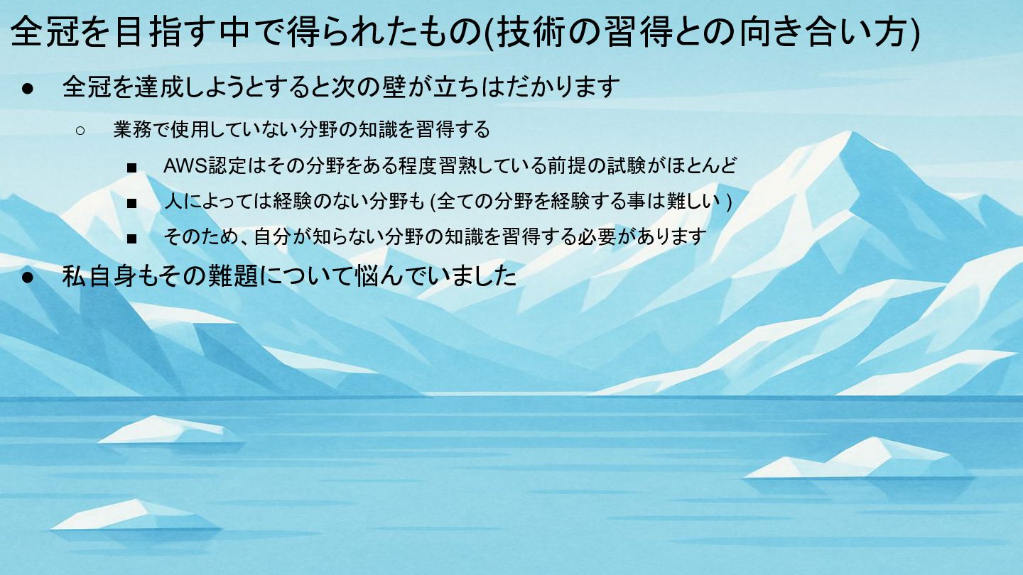 全冠を目指す中で得られたもの(技術の習得との向き合い方) • 全冠を達成しようとすると次の壁が立ちはだかります ◦ 業務で使用していない分野の知識を習得する ▪ AWS認定はその分野をある程度習熟している前提の試験がほとんど ▪ 人によっては経験のない分野も (全ての分野を経験する事は難しい