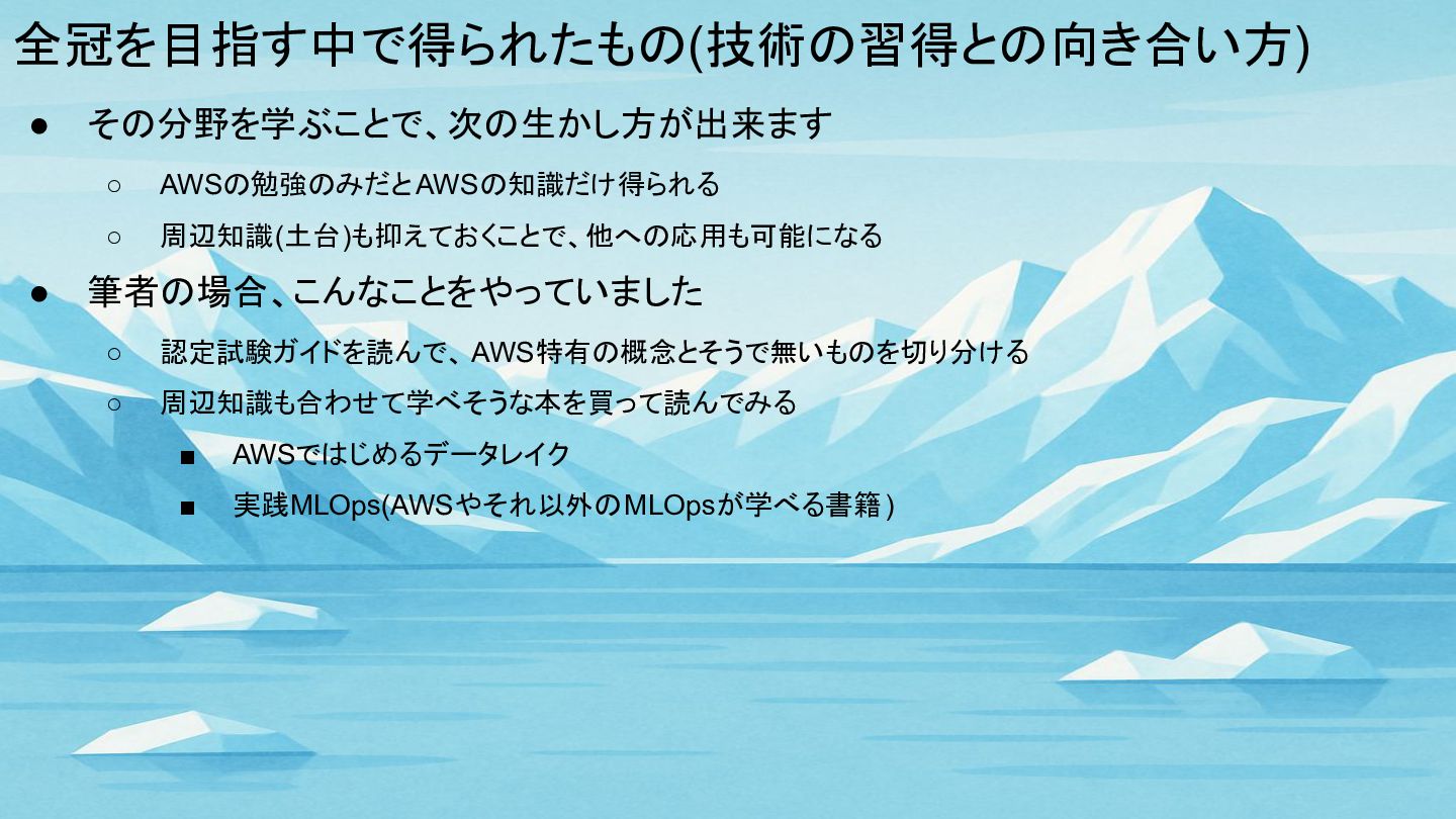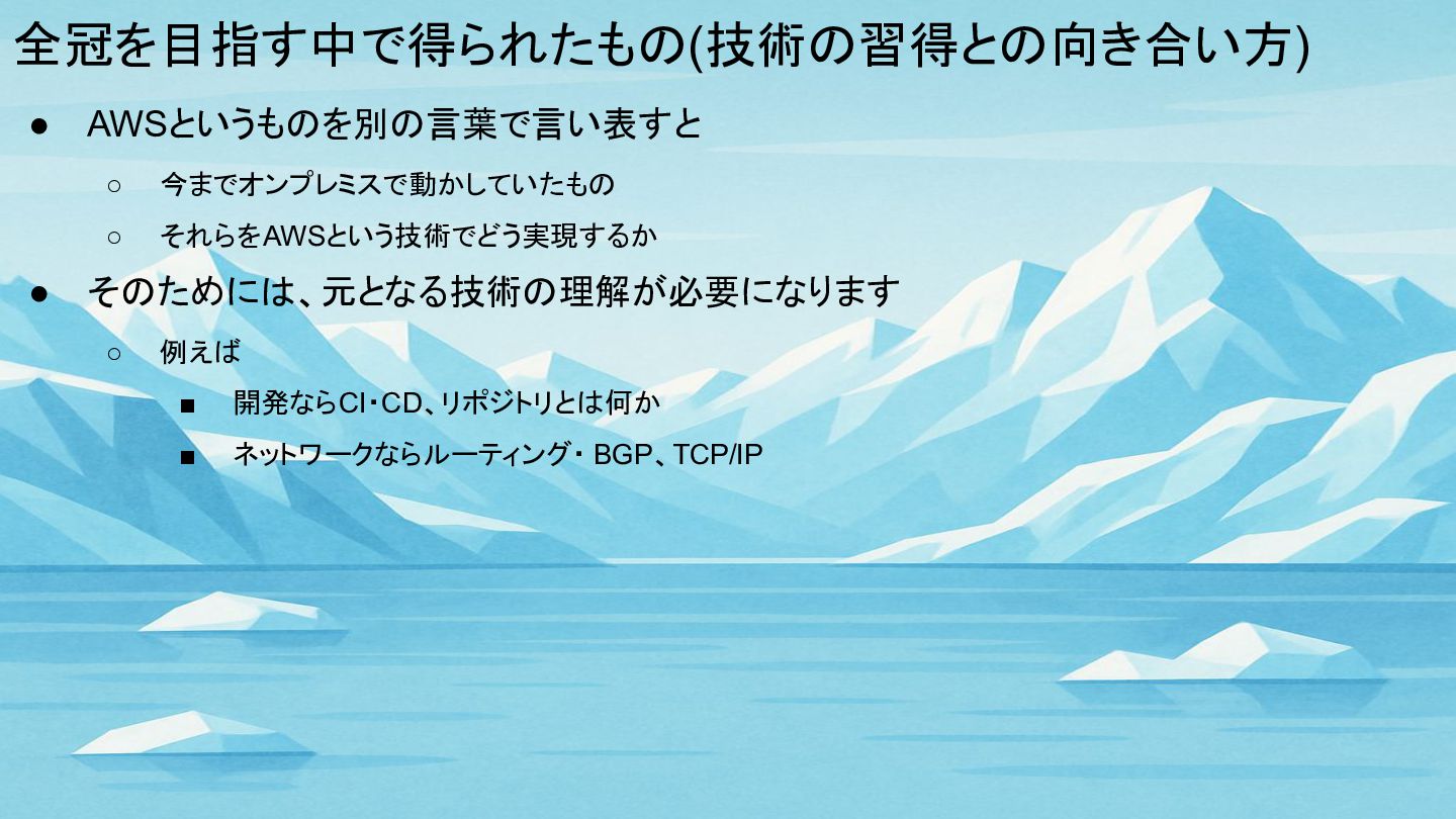 全冠を目指す中で得られたもの(技術の習得との向き合い方) • その分野を学ぶことで、次の生かし方が出来ます ◦ AWSの勉強のみだとAWSの知識だけ得られる ◦ 周辺知識(土台)も抑えておくことで、他への応用も可能になる • 筆者の場合、こんなことをやっていました ◦
