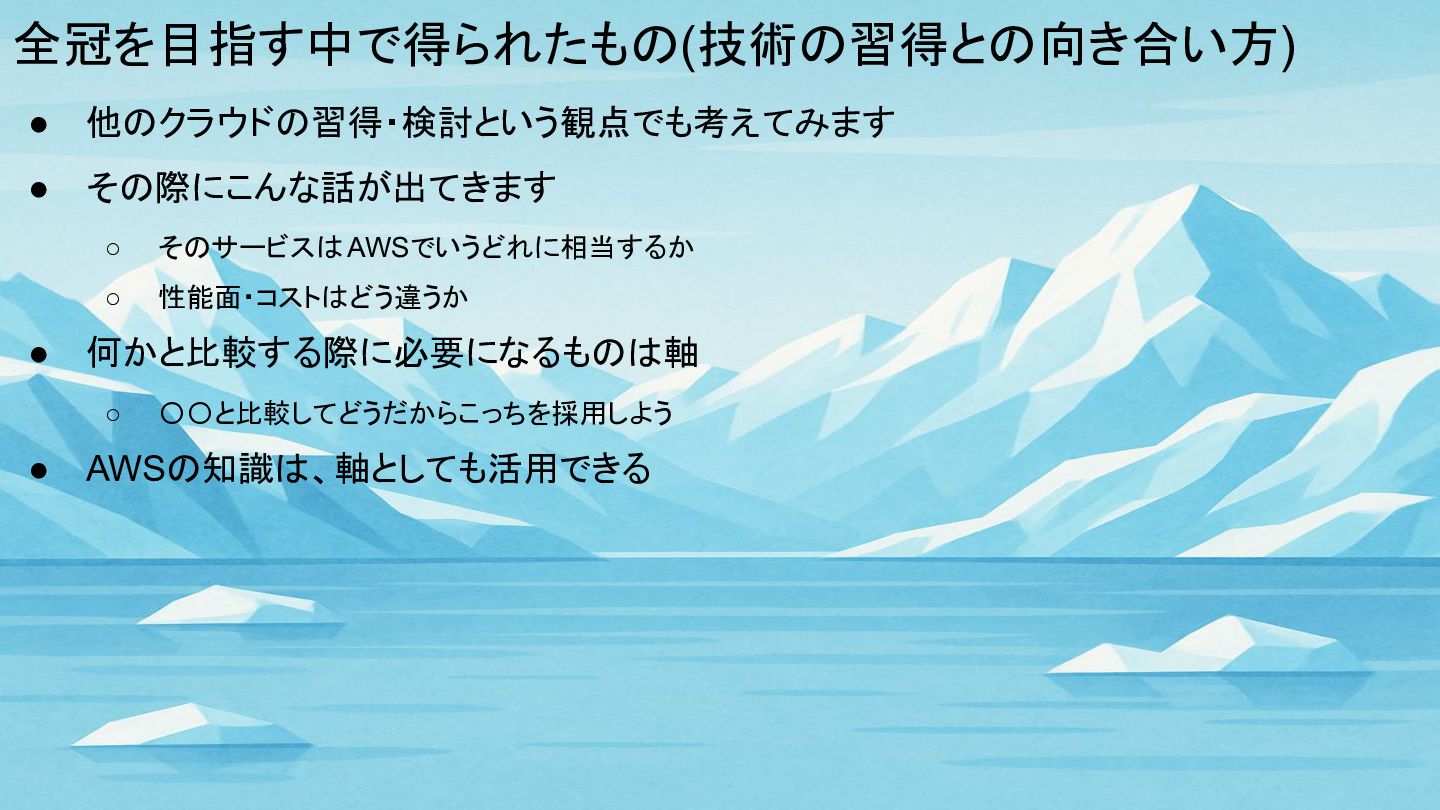 全冠を目指す中で得られたもの(技術の習得との向き合い方) • 他のクラウドの習得・検討という観点でも考えてみます • その際にこんな話が出てきます ◦ そのサービスはAWSでいうどれに相当するか ◦ 性能面・コストはどう違うか •