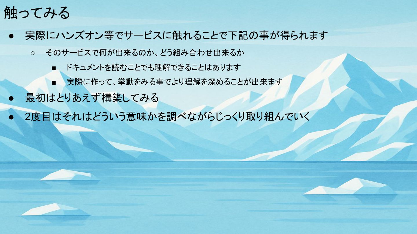 触ってみる • 実際にハンズオン等でサービスに触れることで下記の事が得られます ◦ そのサービスで何が出来るのか、どう組み合わせ出来るか ▪ ドキュメントを読むことでも理解できることはあります ▪ 実際に作って、挙動をみる事でより理解を深めることが出来ます •