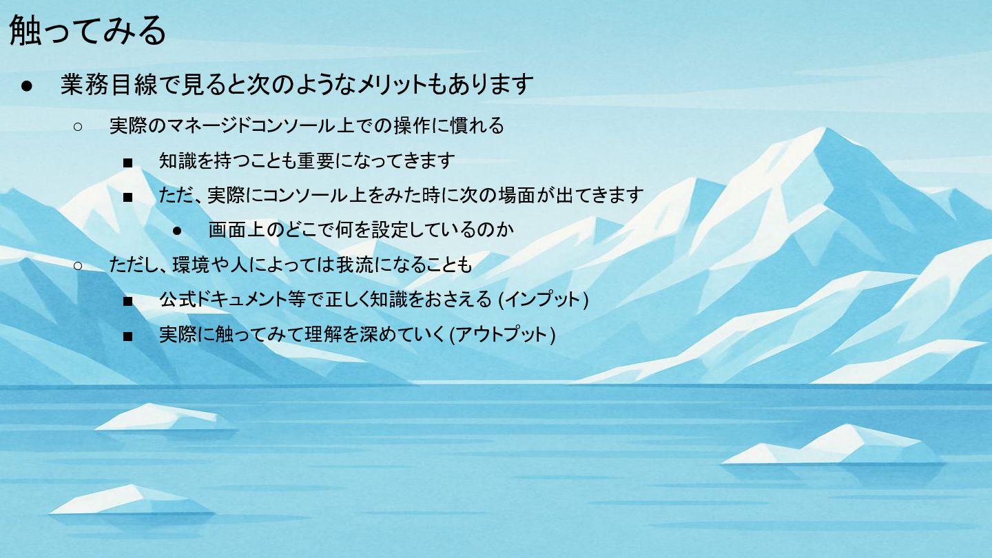 触ってみる • 業務目線で見ると次のようなメリットもあります ◦ 実際のマネージドコンソール上での操作に慣れる ▪ 知識を持つことも重要になってきます ▪ ただ、実際にコンソール上をみた時に次の場面が出てきます •