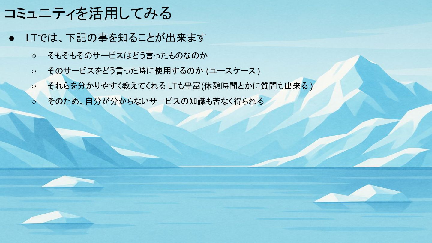 コミュニティを活用してみる • LTでは、下記の事を知ることが出来ます ◦ そもそもそのサービスはどう言ったものなのか ◦ そのサービスをどう言った時に使用するのか (ユースケース) ◦ それらを分かりやすく教えてくれる