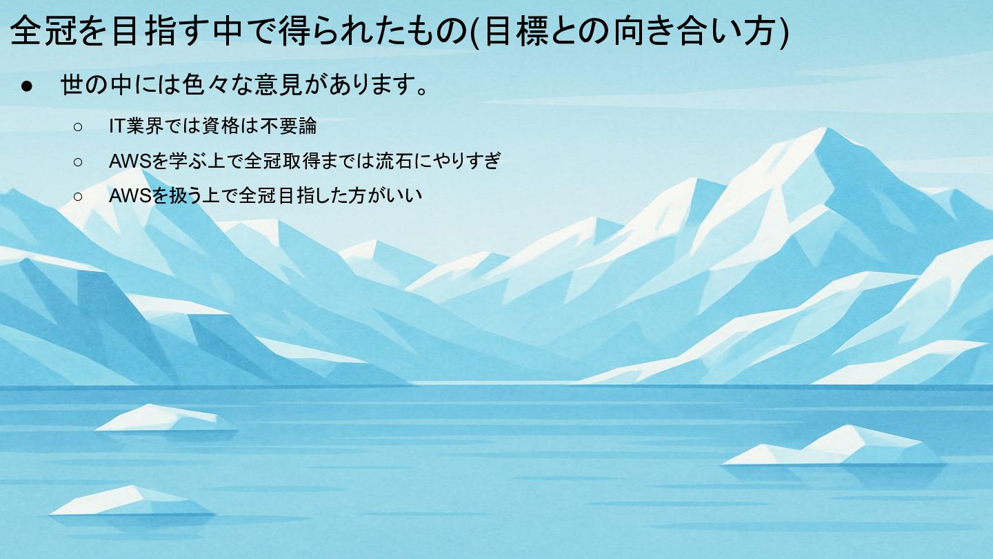 全冠を目指す中で得られたもの(目標との向き合い方) • 世の中には色々な意見があります。 ◦ IT業界では資格は不要論 ◦ AWSを学ぶ上で全冠取得までは流石にやりすぎ ◦ AWSを扱う上で全冠目指した方がいい