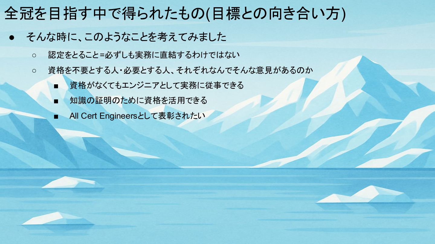 全冠を目指す中で得られたもの(目標との向き合い方) • そんな時に、このようなことを考えてみました ◦ 認定をとること=必ずしも実務に直結するわけではない ◦ 資格を不要とする人・必要とする人、それぞれなんでそんな意見があるのか ▪ 資格がなくてもエンジニアとして実務に従事できる ▪