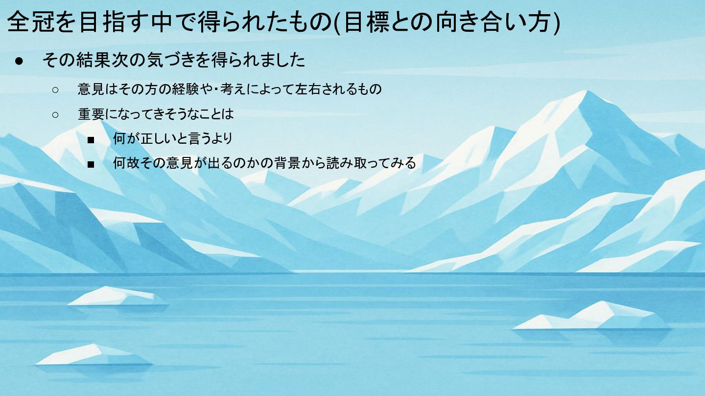 全冠を目指す中で得られたもの(目標との向き合い方) • その結果次の気づきを得られました ◦ 意見はその方の経験や・考えによって左右されるもの ◦ 重要になってきそうなことは ▪ 何が正しいと言うより ▪