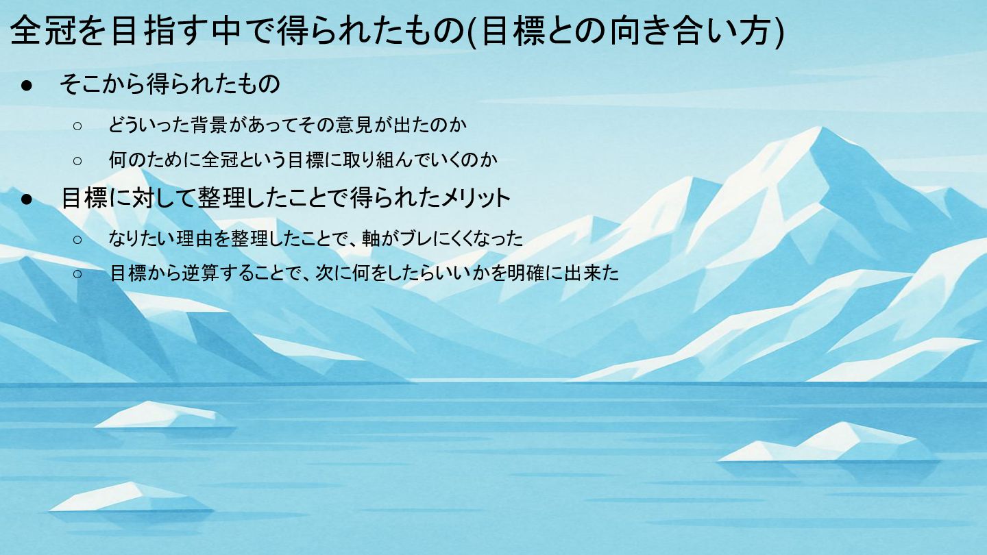 全冠を目指す中で得られたもの(目標との向き合い方) • そこから得られたもの ◦ どういった背景があってその意見が出たのか ◦ 何のために全冠という目標に取り組んでいくのか • 目標に対して整理したことで得られたメリット ◦