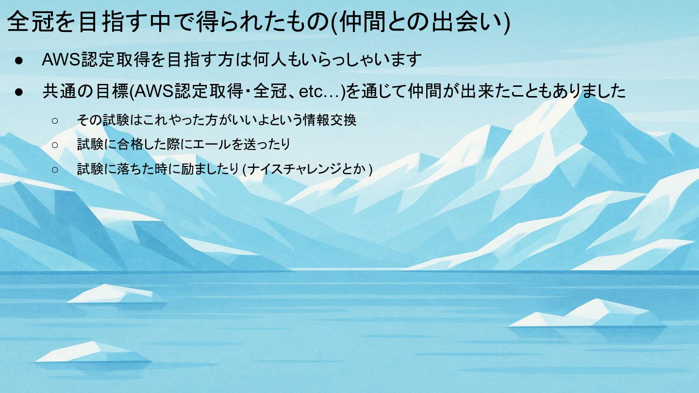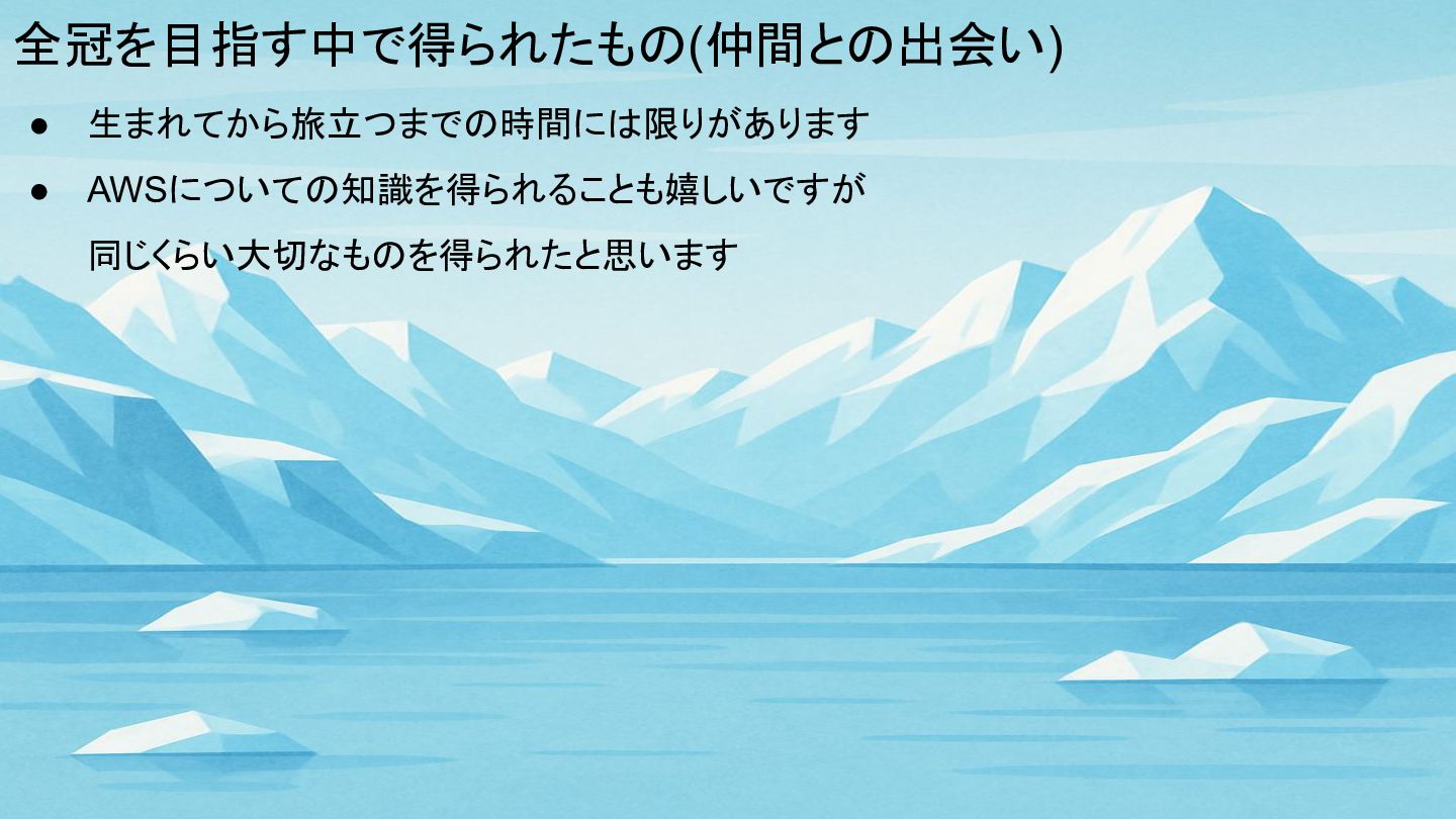 全冠を目指す中で得られたもの(仲間との出会い) • 生まれてから旅立つまでの時間には限りがあります • AWSについての知識を得られることも嬉しいですが 同じくらい大切なものを得られたと思います