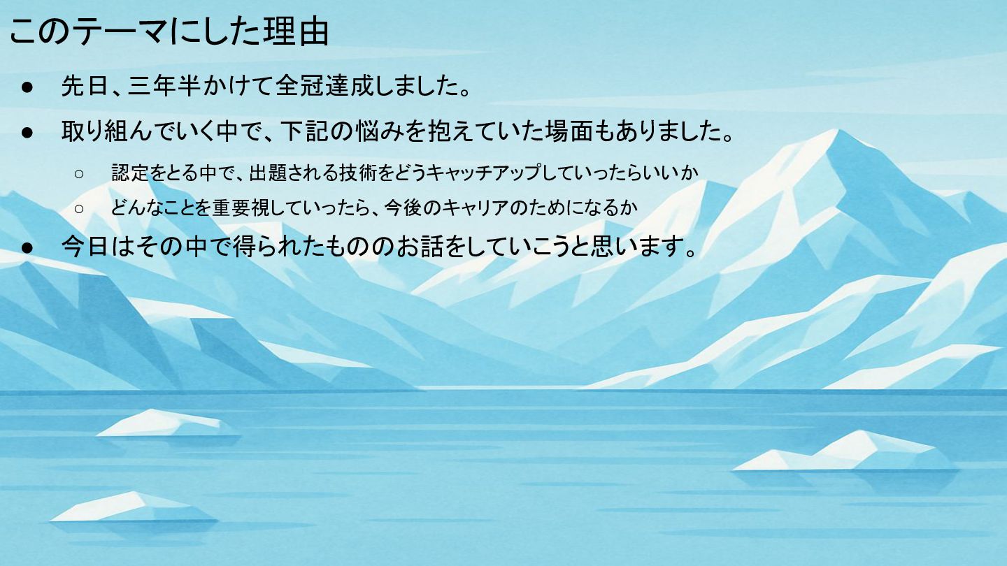 このテーマにした理由 • 先日、三年半かけて全冠達成しました。 • 取り組んでいく中で、下記の悩みを抱えていた場面もありました。 ◦ 認定をとる中で、出題される技術をどうキャッチアップしていったらいいか ◦ どんなことを重要視していったら、今後のキャリアのためになるか •