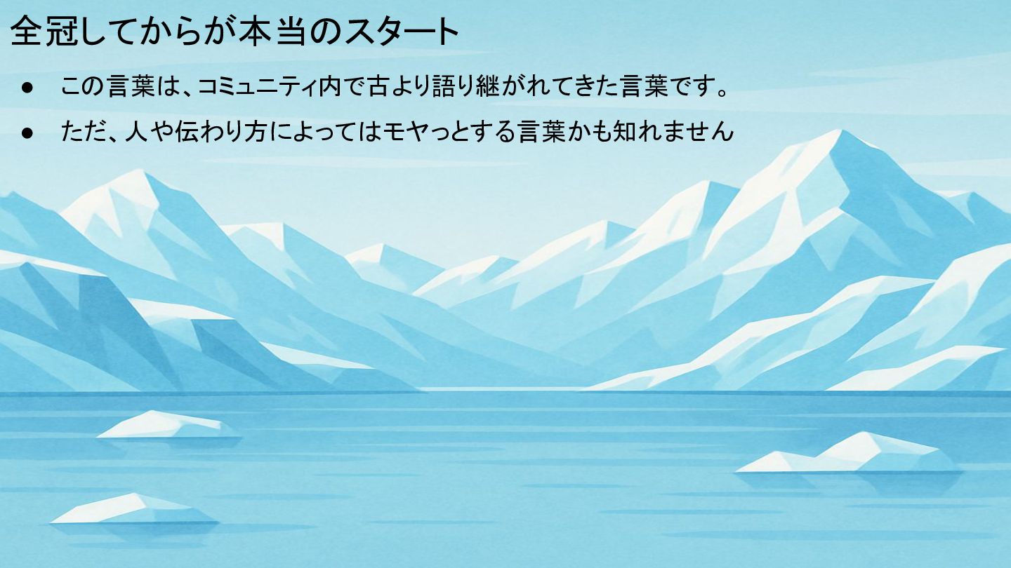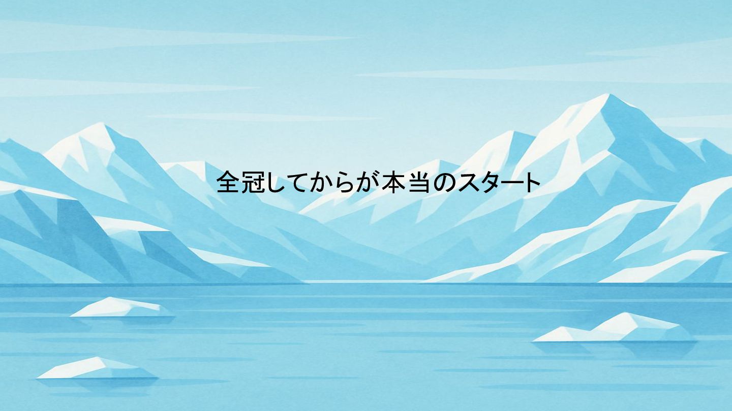 全冠してからが本当のスタート • この言葉は、コミュニティ内で古より語り継がれてきた言葉です。 • ただ、人や伝わり方によってはモヤっとする言葉かも知れません