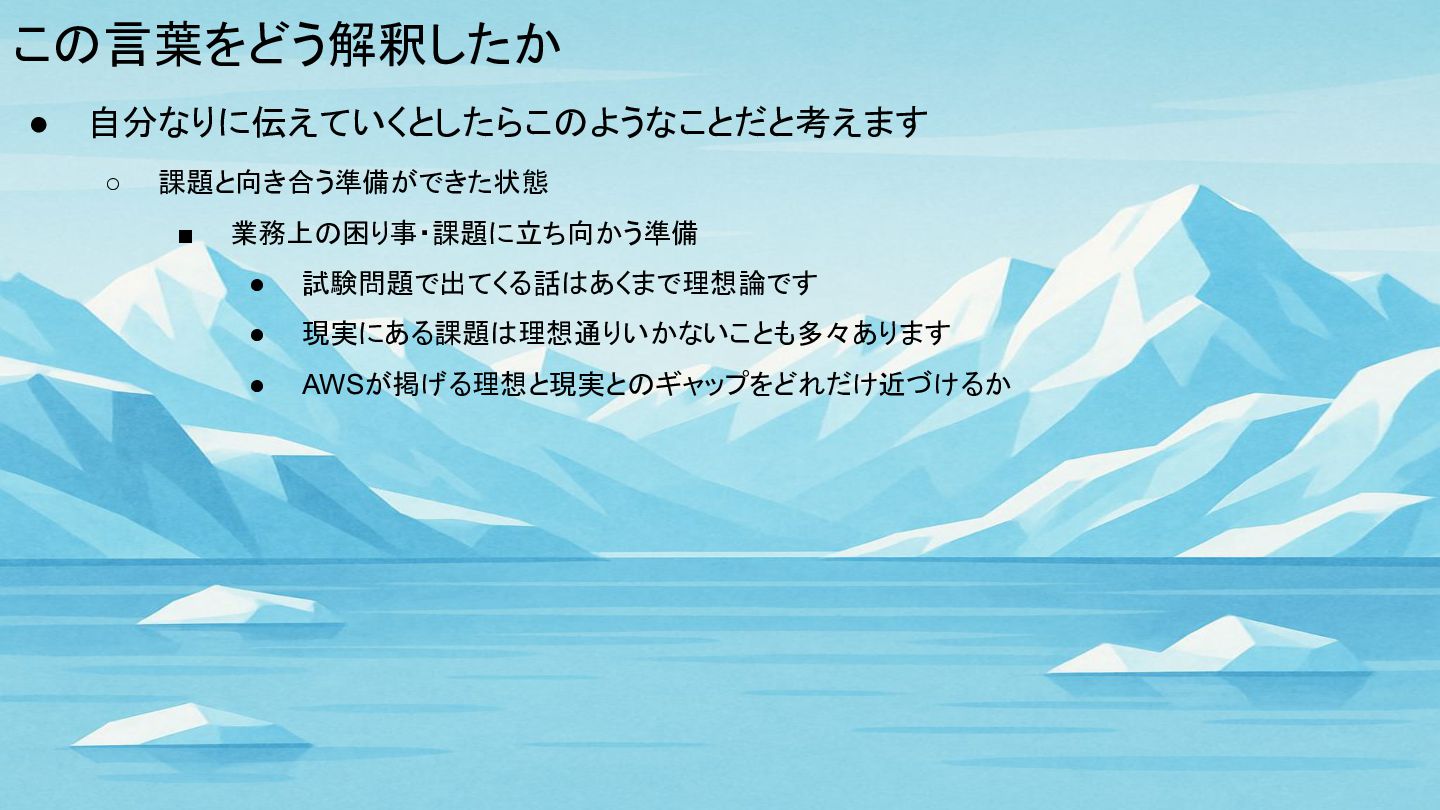この言葉をどう解釈したか • 自分なりに伝えていくとしたらこのようなことだと考えます ◦ 課題と向き合う準備ができた状態 ▪ 業務上の困り事・課題に立ち向かう準備 • 試験問題で出てくる話はあくまで理想論です •