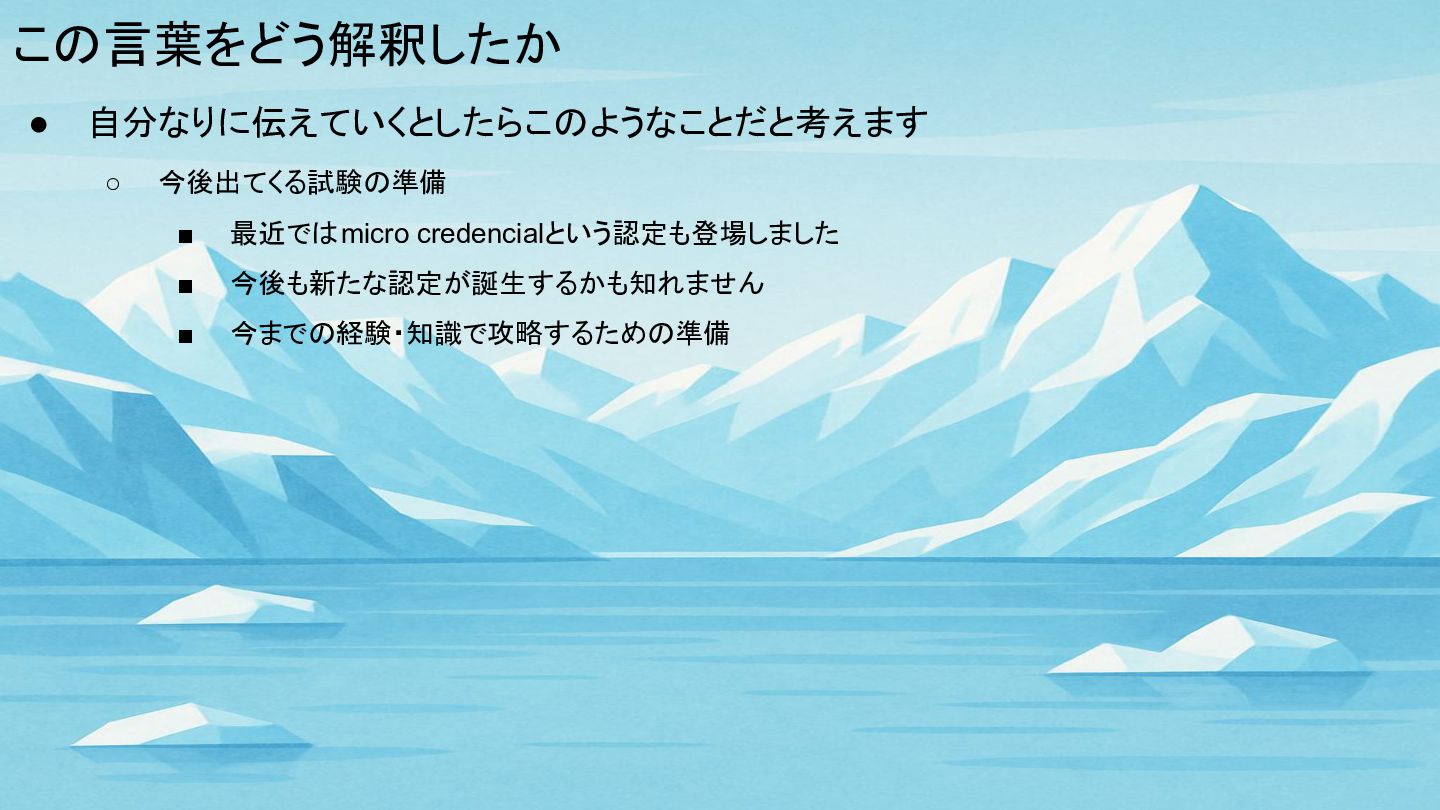 この言葉をどう解釈したか • 自分なりに伝えていくとしたらこのようなことだと考えます ◦ 今後出てくる試験の準備 ▪ 最近ではmicro credencialという認定も登場しました ▪ 今後も新たな認定が誕生するかも知れません