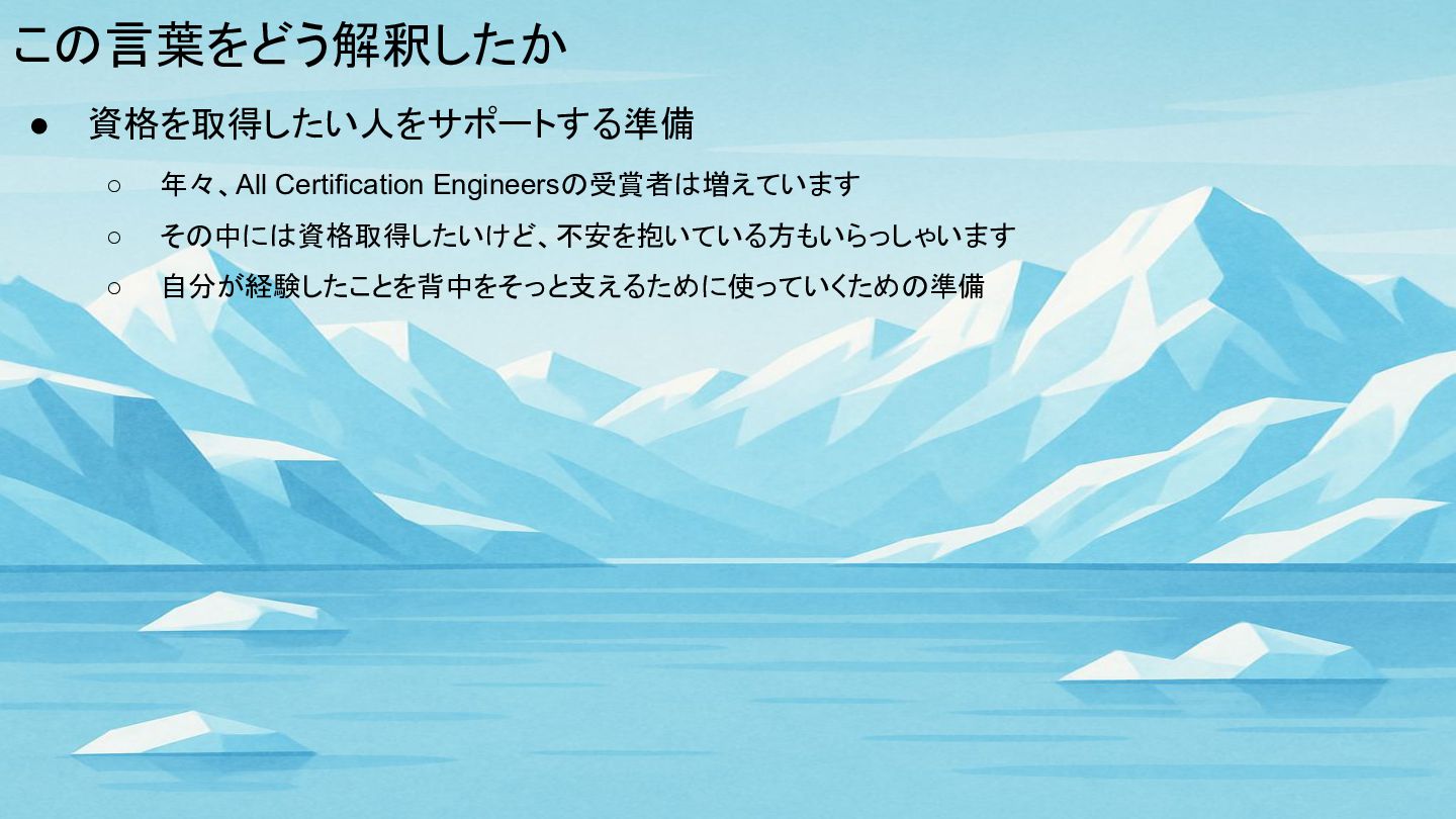 この言葉をどう解釈したか • 資格を取得したい人をサポートする準備 ◦ 年々、All Certification Engineersの受賞者は増えています ◦ その中には資格取得したいけど、不安を抱いている方もいらっしゃいます ◦