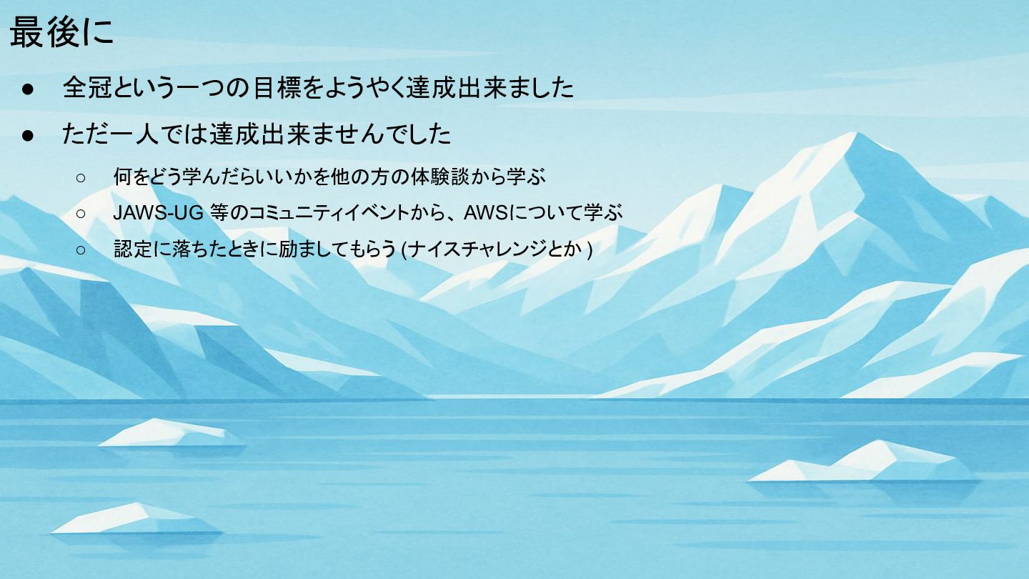 最後に • 全冠という一つの目標をようやく達成出来ました • ただ一人では達成出来ませんでした ◦ 何をどう学んだらいいかを他の方の体験談から学ぶ ◦ JAWS-UG 等のコミュニティイベントから、