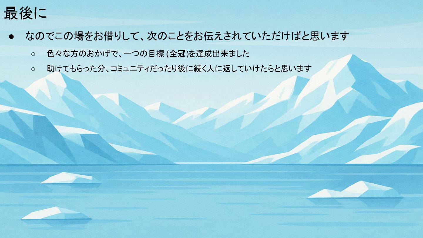 最後に • なのでこの場をお借りして、次のことをお伝えされていただけばと思います ◦ 色々な方のおかげで、一つの目標 (全冠)を達成出来ました ◦ 助けてもらった分、コミュニティだったり後に続く人に返していけたらと思います