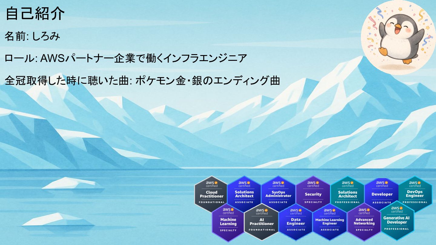 自己紹介 名前: しろみ ロール: AWSパートナー企業で働くインフラエンジニア 全冠取得した時に聴いた曲: ポケモン金・銀のエンディング曲