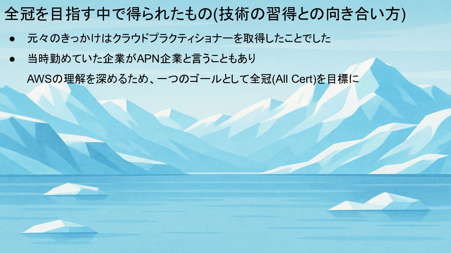 全冠を目指す中で得られたもの(技術の習得との向き合い方) • 元々のきっかけはクラウドプラクティショナーを取得したことでした • 当時勤めていた企業がAPN企業と言うこともあり AWSの理解を深めるため、一つのゴールとして全冠(All Cert)を目標に