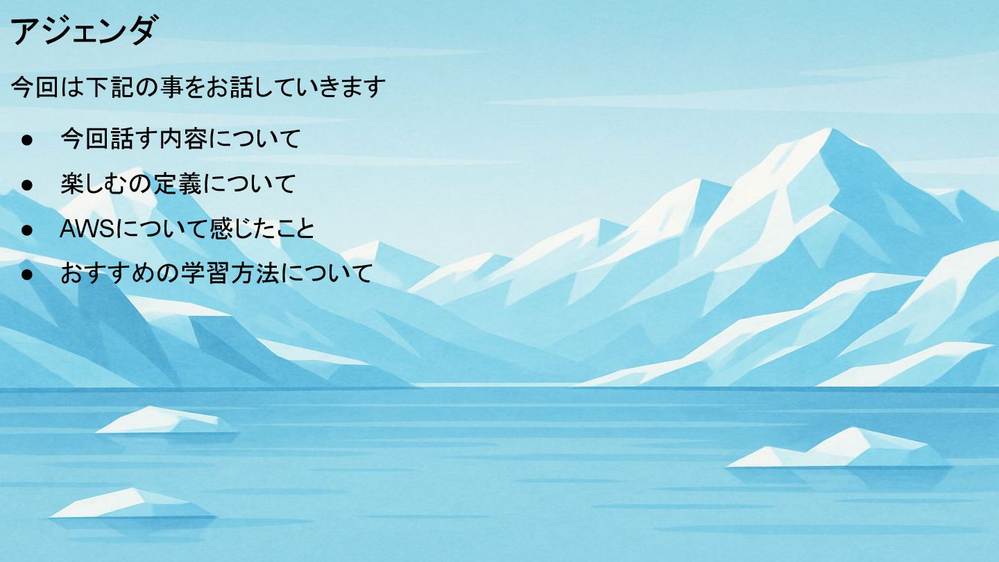 アジェンダ 今回は下記の事をお話していきます • 今回話す内容について • 楽しむの定義について • AWSについて感じたこと • おすすめの学習方法について