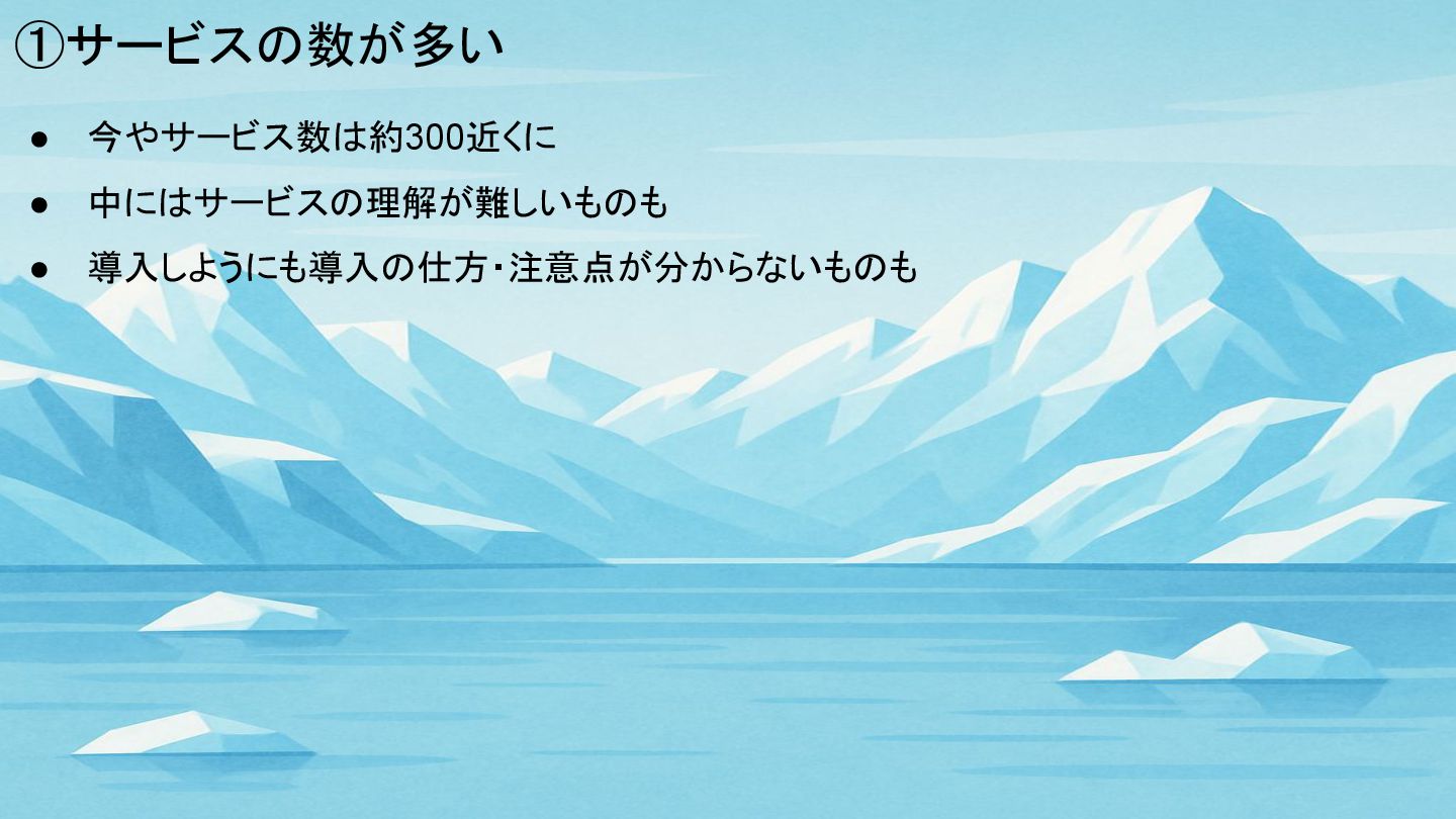 ①サービスの数が多い • 今やサービス数は約300近くに • 中にはサービスの理解が難しいものも • 導入しようにも導入の仕方・注意点が分からないものも