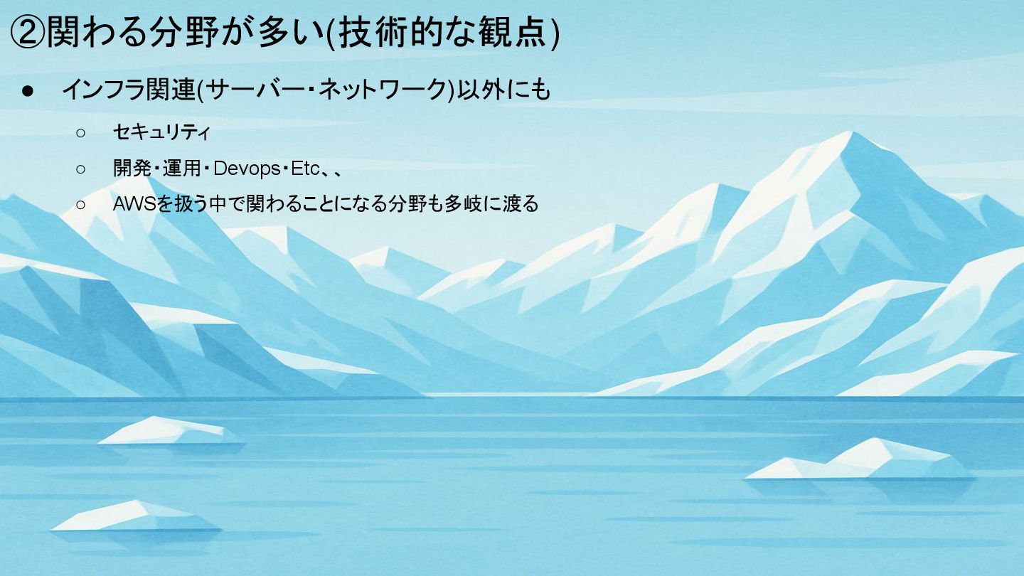②関わる分野が多い(技術的な観点) • インフラ関連(サーバー・ネットワーク)以外にも ◦ セキュリティ ◦ 開発・運用・Devops・Etc、、 ◦ AWSを扱う中で関わることになる分野も多岐に渡る