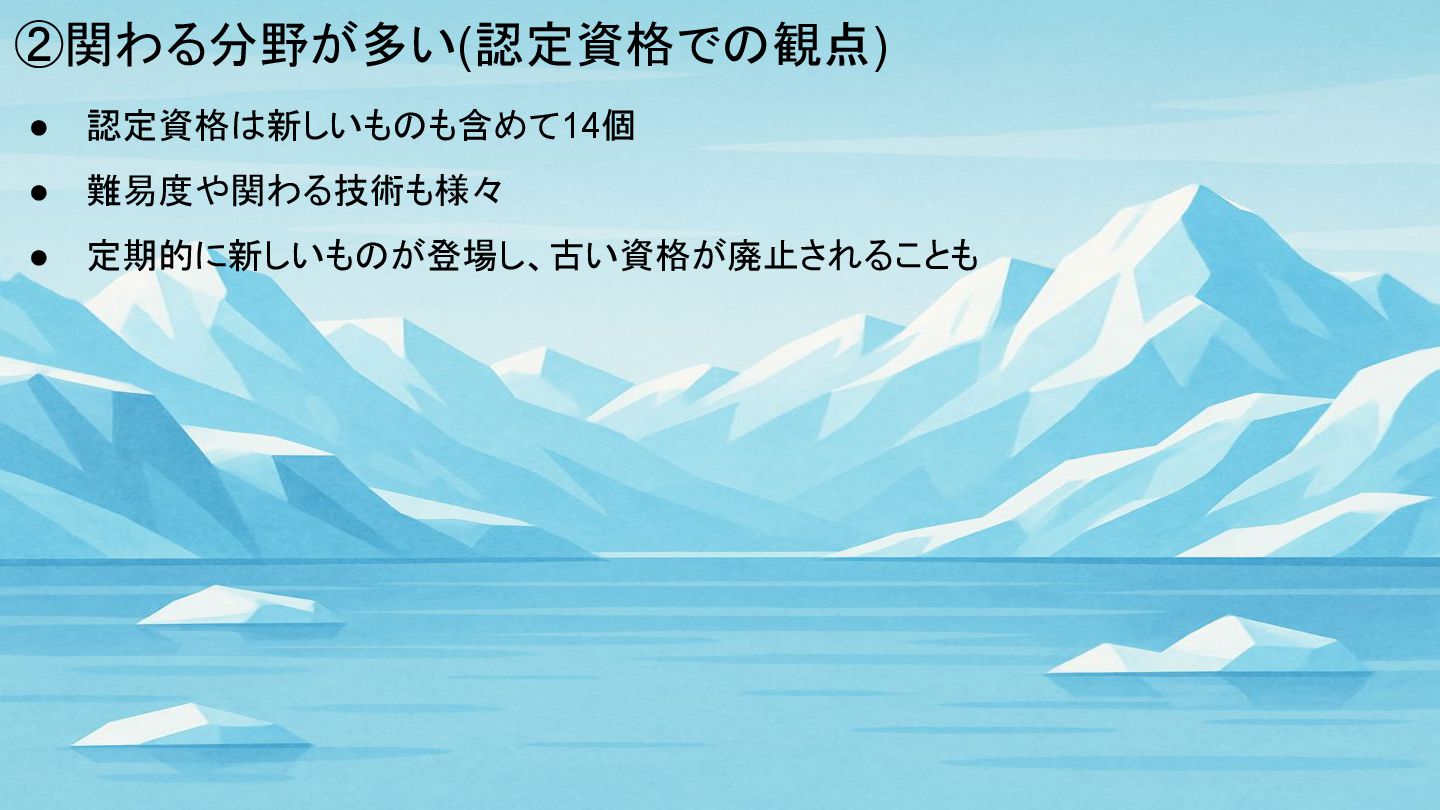 ②関わる分野が多い(認定資格での観点) • 認定資格は新しいものも含めて14個 • 難易度や関わる技術も様々 • 定期的に新しいものが登場し、古い資格が廃止されることも