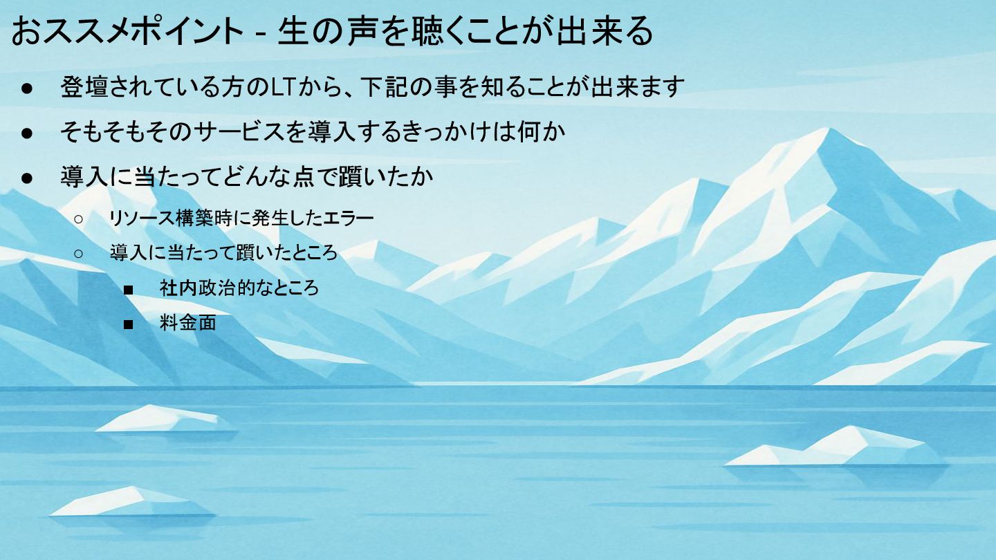 おススメポイント - 生の声を聴くことが出来る • 登壇されている方のLTから、下記の事を知ることが出来ます • そもそもそのサービスを導入するきっかけは何か • 導入に当たってどんな点で躓いたか ◦