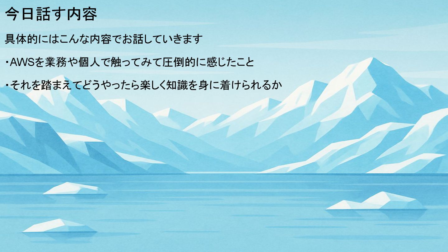 今日話す内容 具体的にはこんな内容でお話していきます ・AWSを業務や個人で触ってみて圧倒的に感じたこと ・それを踏まえてどうやったら楽しく知識を身に着けられるか