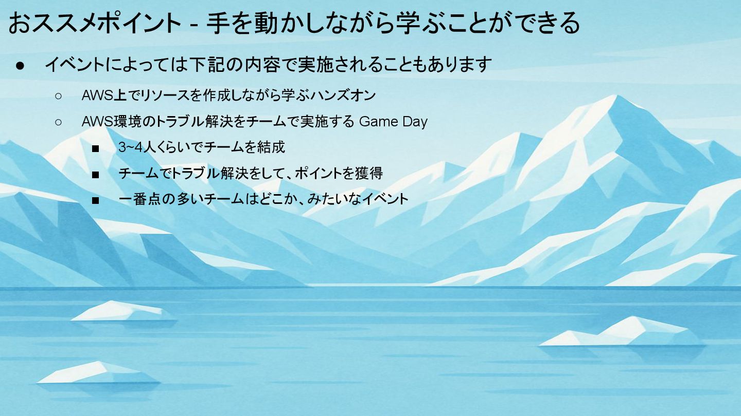 おススメポイント - 手を動かしながら学ぶことができる • イベントによっては下記の内容で実施されることもあります ◦ AWS上でリソースを作成しながら学ぶハンズオン ◦ AWS環境のトラブル解決をチームで実施する Game