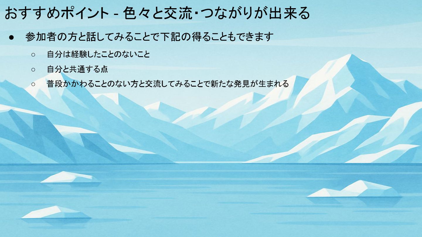 おすすめポイント - 色々と交流・つながりが出来る • 参加者の方と話してみることで下記の得ることもできます ◦ 自分は経験したことのないこと ◦ 自分と共通する点 ◦