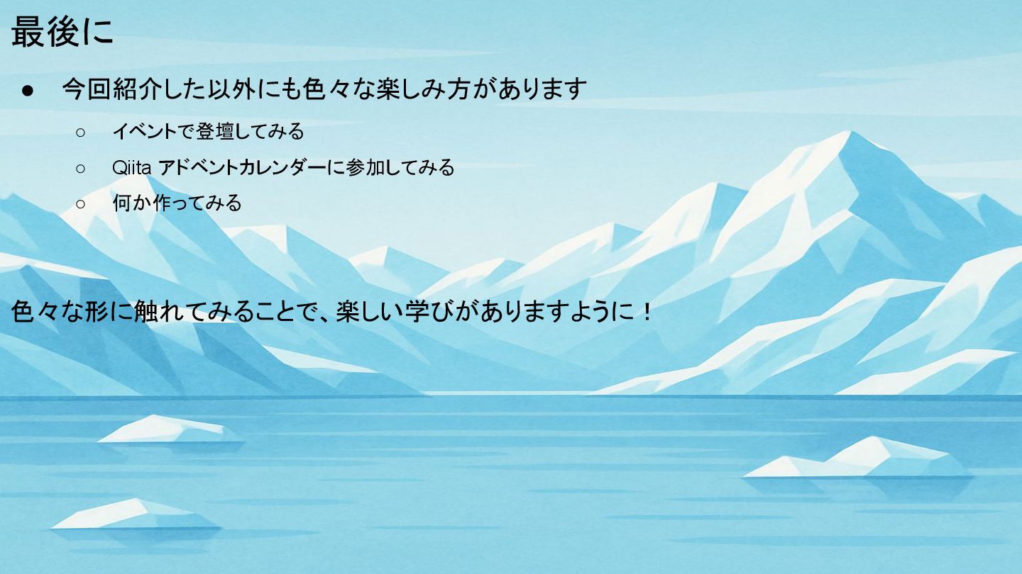 最後に • 今回紹介した以外にも色々な楽しみ方があります ◦ イベントで登壇してみる ◦ Qiita アドベントカレンダーに参加してみる ◦ 何か作ってみる