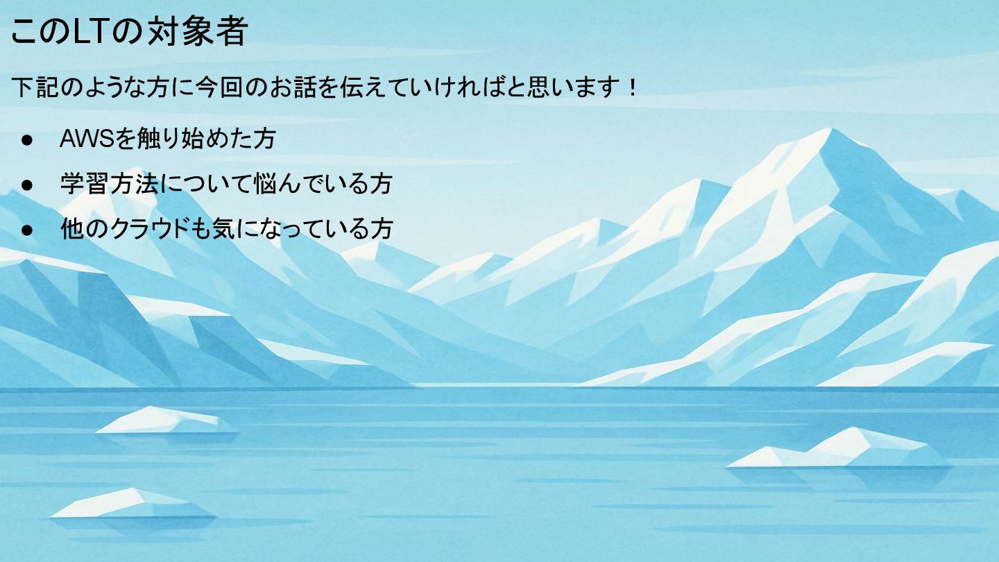 このLTの対象者 下記のような方に今回のお話を伝えていければと思います! • AWSを触り始めた方 • 学習方法について悩んでいる方 • 他のクラウドも気になっている方