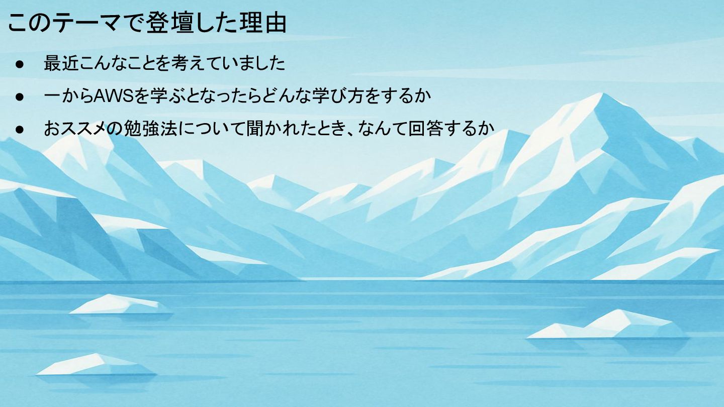 このテーマで登壇した理由 • 最近こんなことを考えていました • 一からAWSを学ぶとなったらどんな学び方をするか • おススメの勉強法について聞かれたとき、なんて回答するか