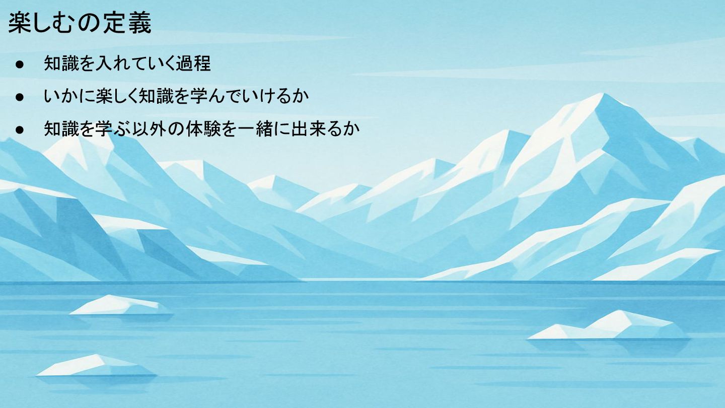 楽しむの定義 • 知識を入れていく過程 • いかに楽しく知識を学んでいけるか • 知識を学ぶ以外の体験を一緒に出来るか