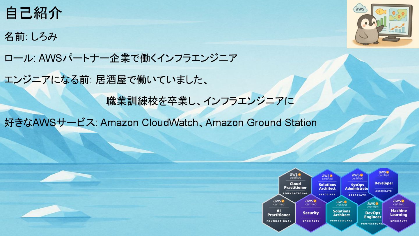 自己紹介 名前: しろみ ロール: AWSパートナー企業で働くインフラエンジニア エンジニアになる前: 居酒屋で働いていました、 職業訓練校を卒業し、インフラエンジニアに 好きなAWSサービス: Amazon