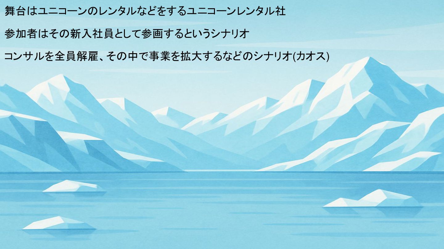 舞台はユニコーンのレンタルなどをするユニコーンレンタル社 参加者はその新入社員として参画するというシナリオ コンサルを全員解雇、その中で事業を拡大するなどのシナリオ(カオス)