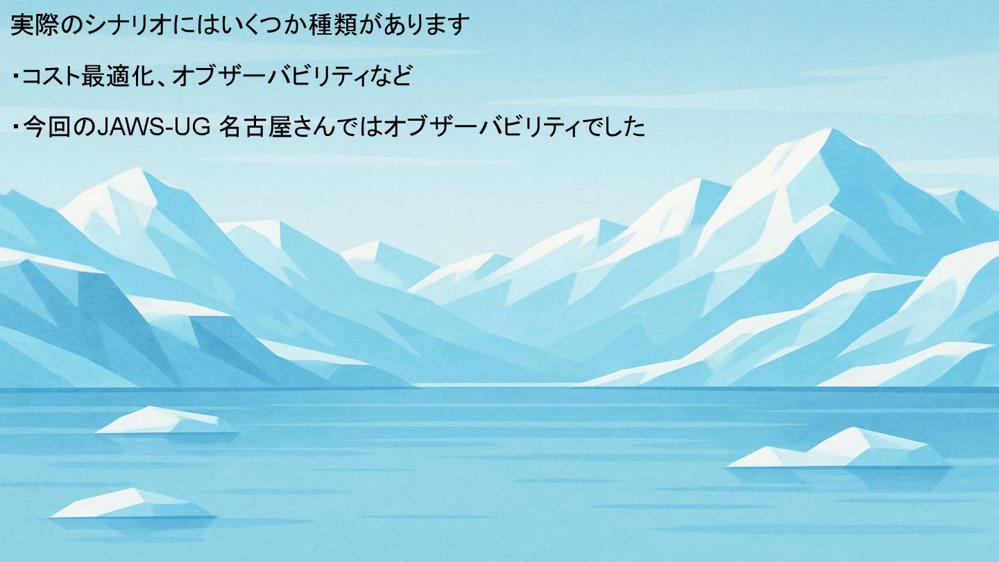 実際のシナリオにはいくつか種類があります ・コスト最適化、オブザーバビリティなど ・今回のJAWS-UG 名古屋さんではオブザーバビリティでした