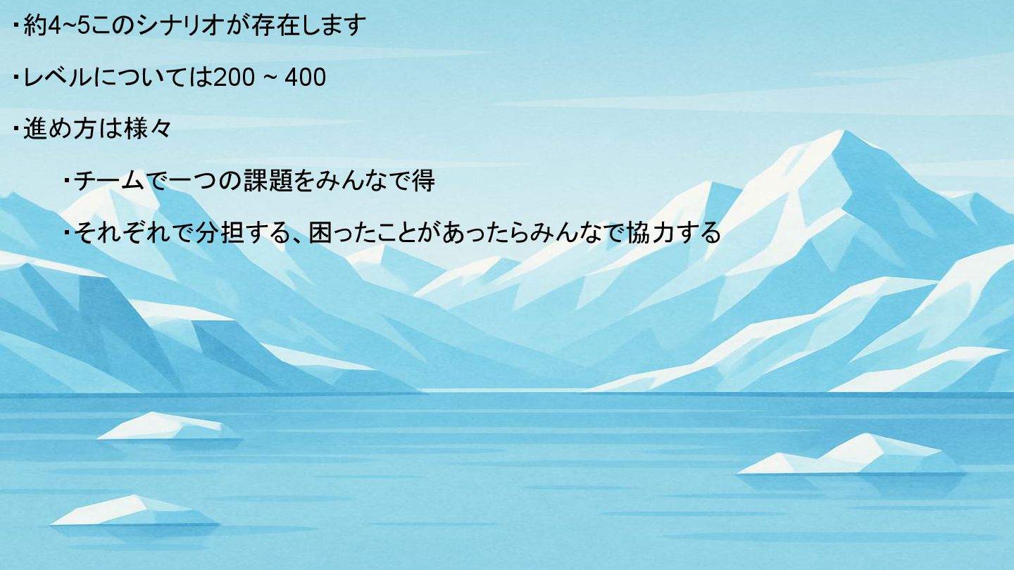 ・約4~5このシナリオが存在します ・レベルについては200 ~ 400 ・進め方は様々 ・チームで一つの課題をみんなで得 ・それぞれで分担する、困ったことがあったらみんなで協力する