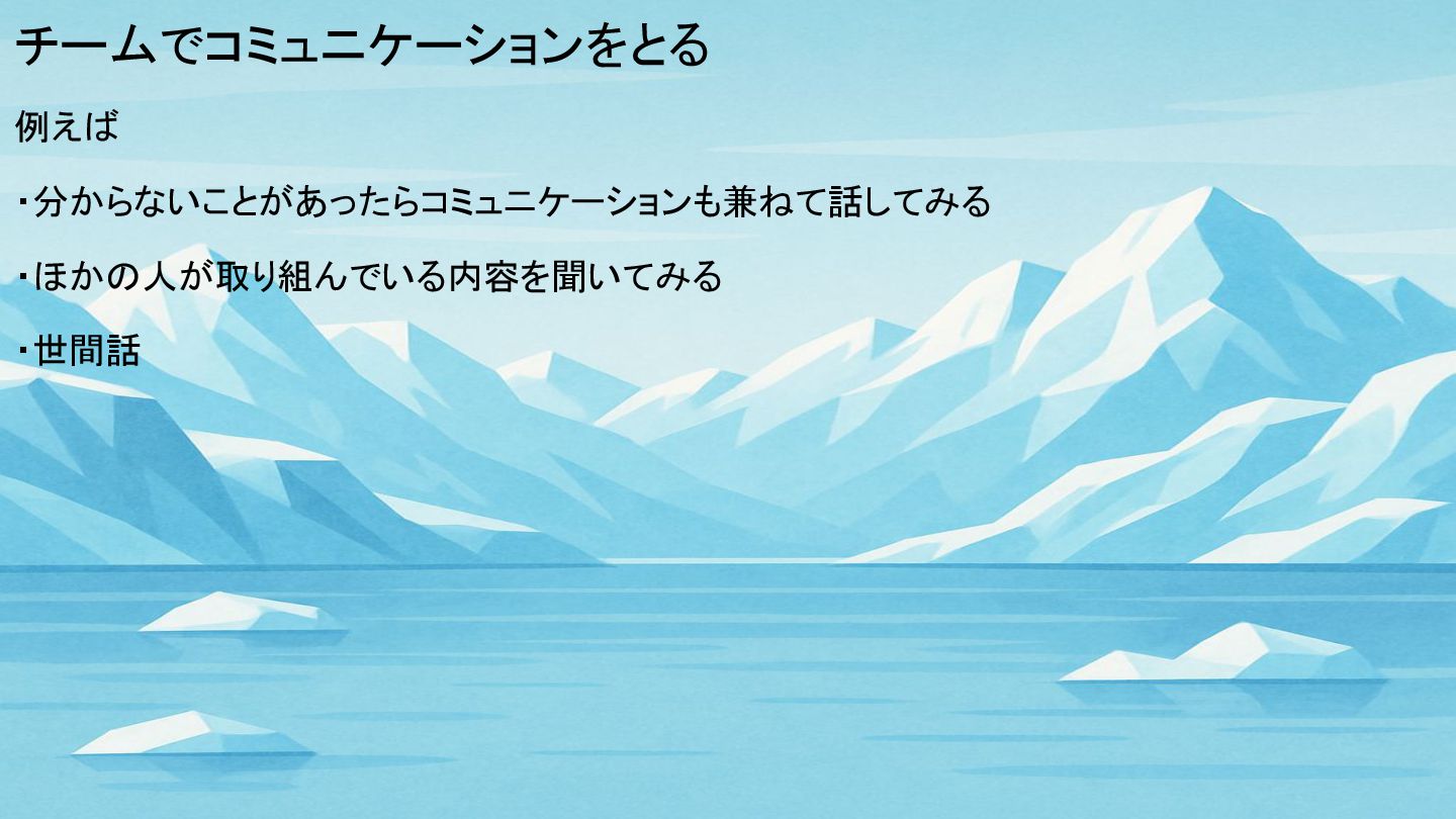 チームでコミュニケーションをとる 例えば ・分からないことがあったらコミュニケーションも兼ねて話してみる ・ほかの人が取り組んでいる内容を聞いてみる ・世間話