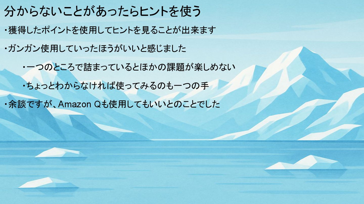 分からないことがあったらヒントを使う ・獲得したポイントを使用してヒントを見ることが出来ます ・ガンガン使用していったほうがいいと感じました ・一つのところで詰まっているとほかの課題が楽しめない ・ちょっとわからなければ使ってみるのも一つの手 ・余談ですが、Amazon Qも使用してもいいとのことでした