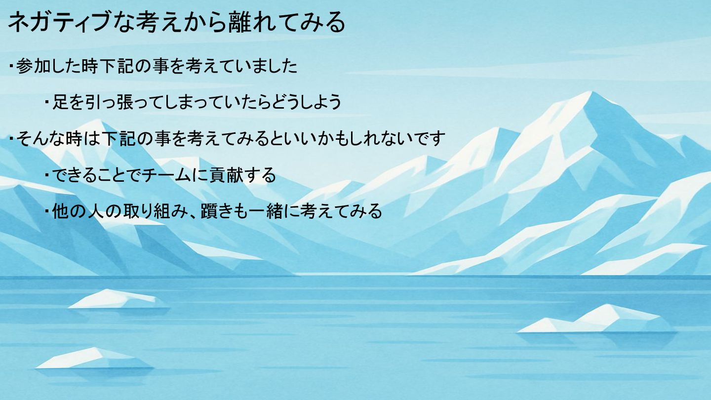 ネガティブな考えから離れてみる ・参加した時下記の事を考えていました ・足を引っ張ってしまっていたらどうしよう ・そんな時は下記の事を考えてみるといいかもしれないです ・できることでチームに貢献する ・他の人の取り組み、躓きも一緒に考えてみる