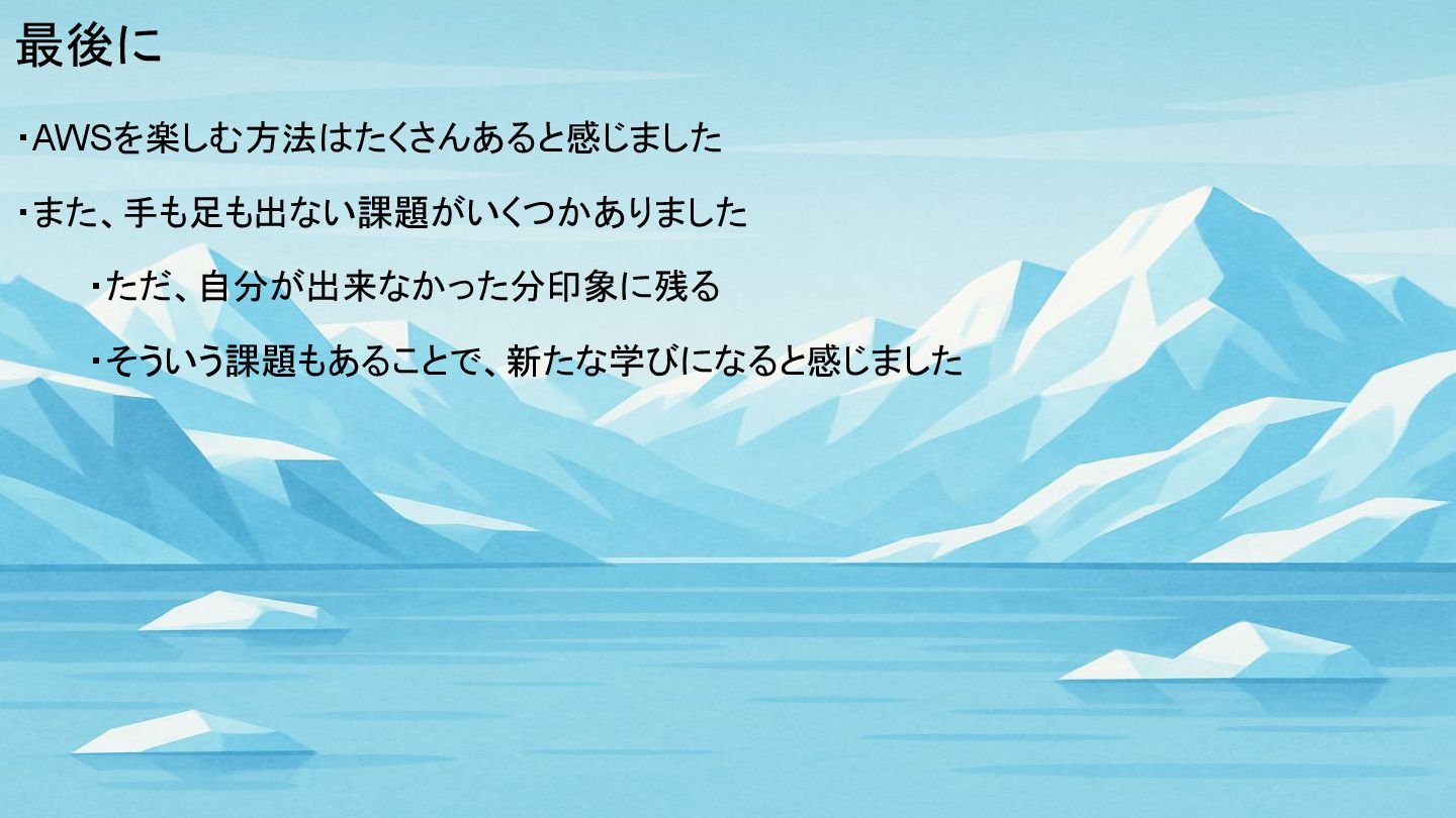 最後に ・AWSを楽しむ方法はたくさんあると感じました ・また、手も足も出ない課題がいくつかありました ・ただ、自分が出来なかった分印象に残る ・そういう課題もあることで、新たな学びになると感じました