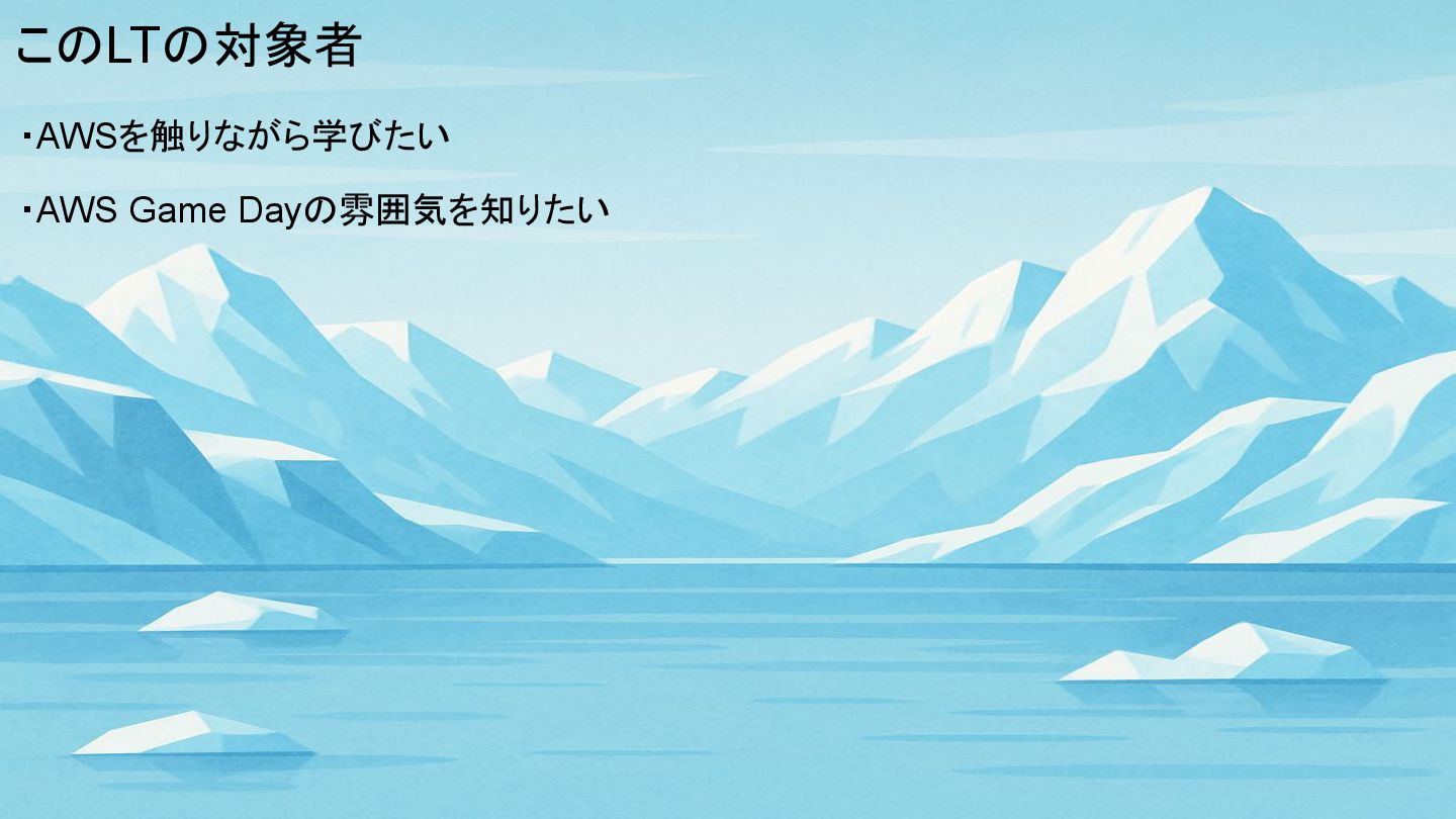このLTの対象者 ・AWSを触りながら学びたい ・AWS Game Dayの雰囲気を知りたい