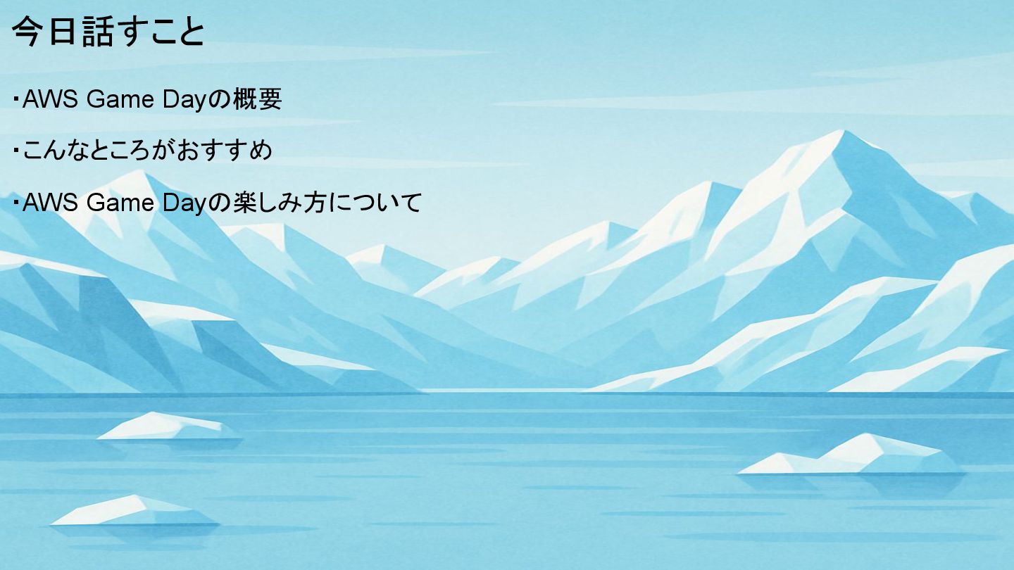 今日話すこと ・AWS Game Dayの概要 ・こんなところがおすすめ ・AWS Game Dayの楽しみ方について