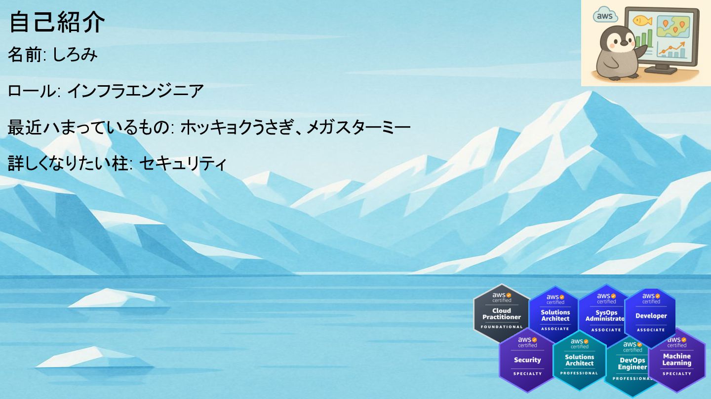 自己紹介 名前: しろみ ロール: インフラエンジニア 最近ハまっているもの: ホッキョクうさぎ、メガスターミー 詳しくなりたい柱: セキュリティ