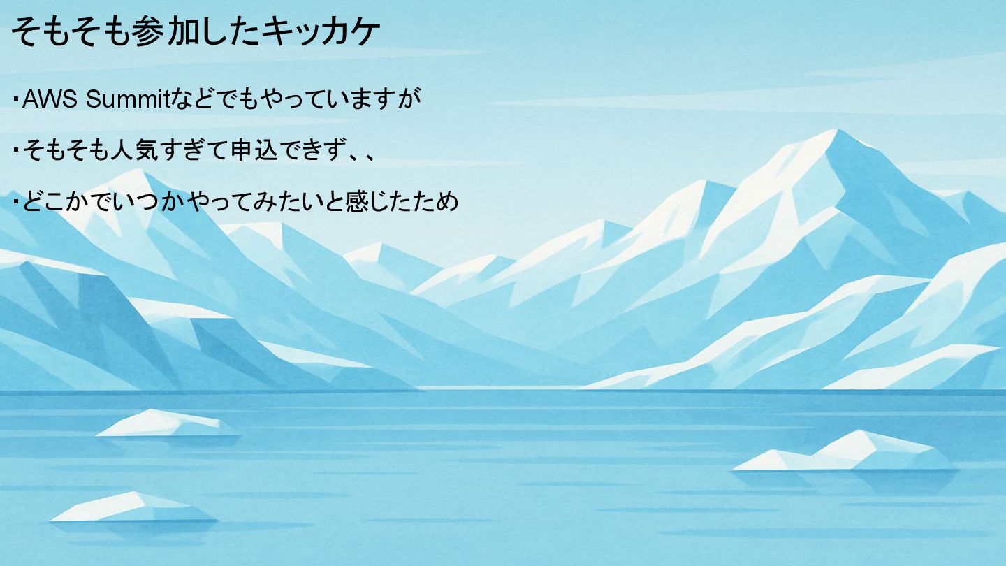 そもそも参加したキッカケ ・AWS Summitなどでもやっていますが ・そもそも人気すぎて申込できず、、 ・どこかでいつかやってみたいと感じたため