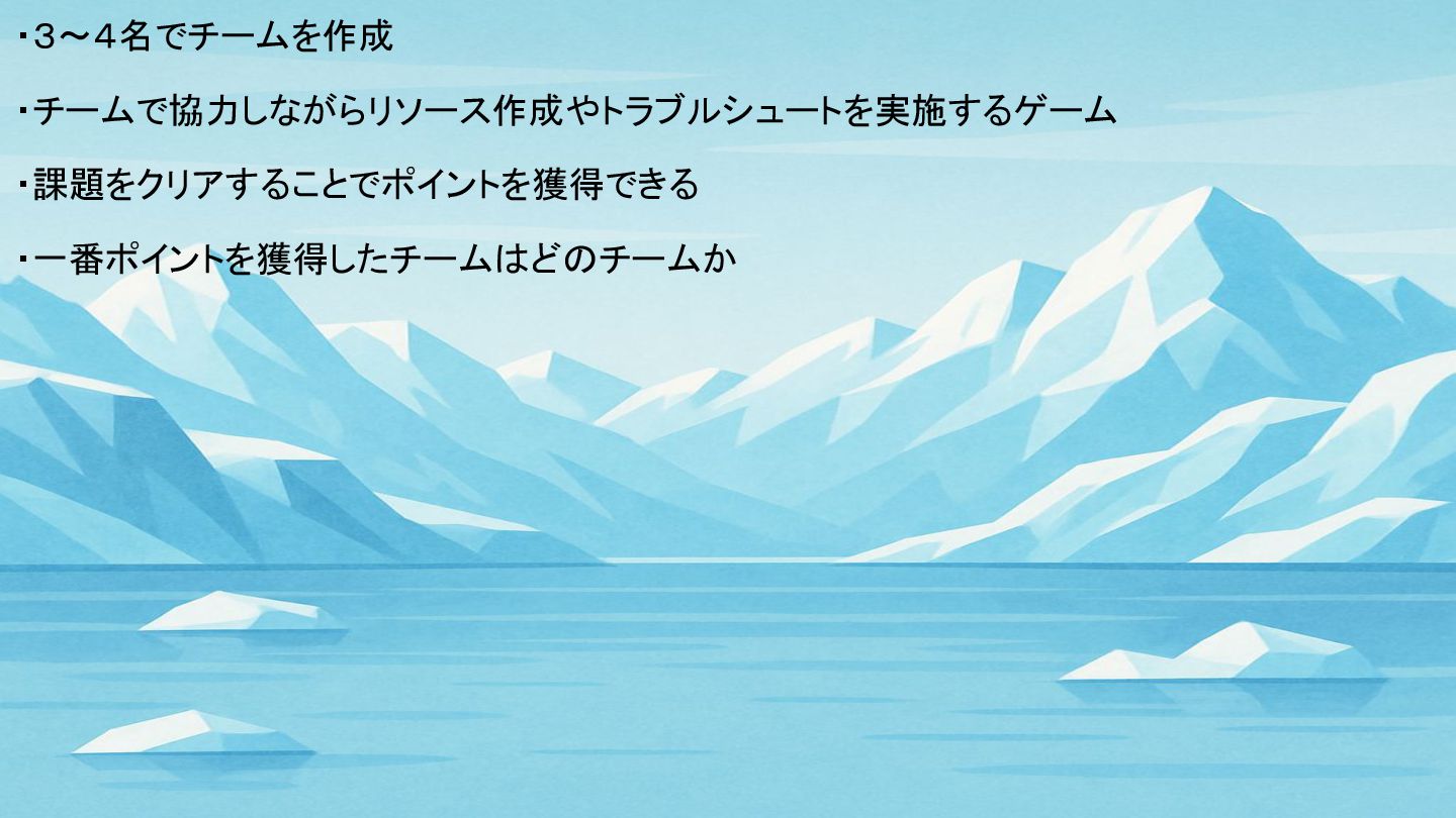・3~4名でチームを作成 ・チームで協力しながらリソース作成やトラブルシュートを実施するゲーム ・課題をクリアすることでポイントを獲得できる ・一番ポイントを獲得したチームはどのチームか