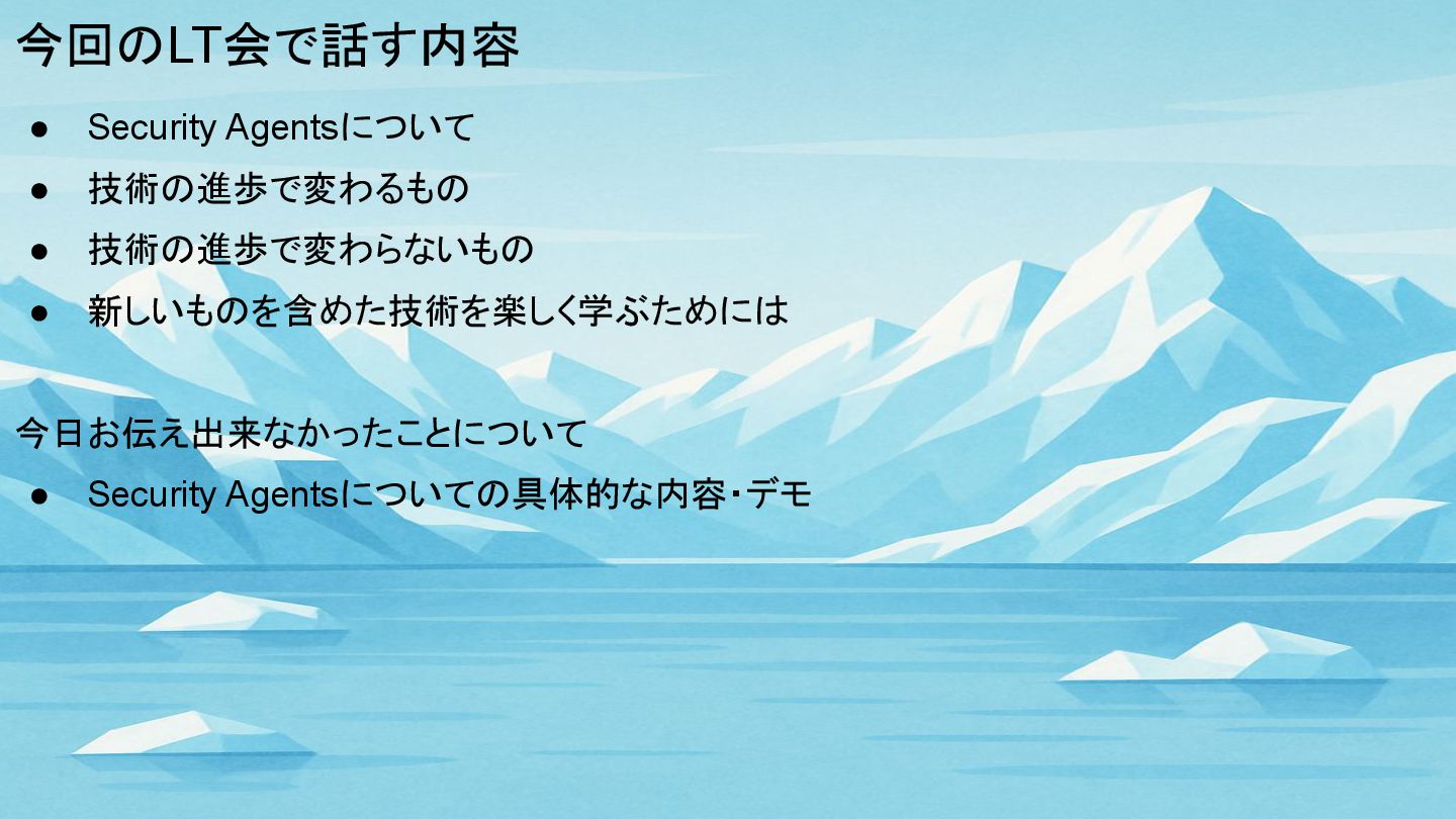 今回のLT会で話す内容 • Security Agentsについて • 技術の進歩で変わるもの • 技術の進歩で変わらないもの • 新しいものを含めた技術を楽しく学ぶためには