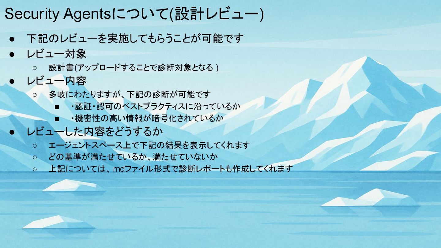 Security Agentsについて(設計レビュー) • 下記のレビューを実施してもらうことが可能です • レビュー対象 ◦ 設計書(アップロードすることで診断対象となる ) •