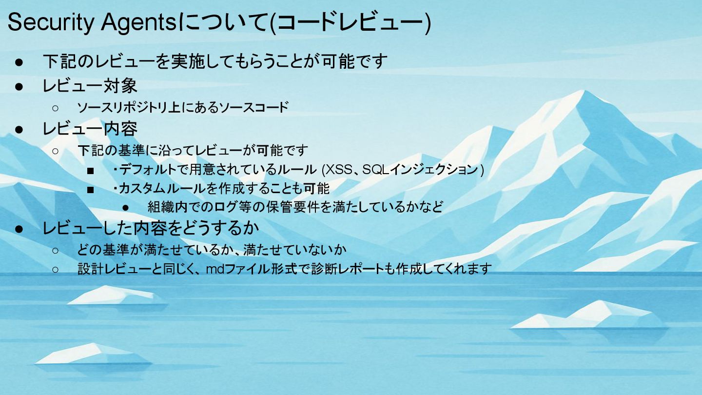 Security Agentsについて(コードレビュー) • 下記のレビューを実施してもらうことが可能です • レビュー対象 ◦ ソースリポジトリ上にあるソースコード • レビュー内容
